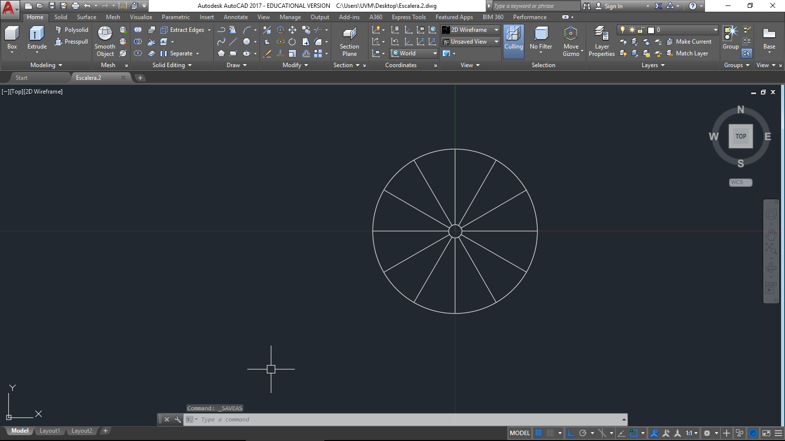 Como primer paso se realiza el dibujo 2D, en cual consiste en trazar un circulo base de dos metros de diámetro (coordenada 0,0), igualmente se realizó un círculo de .08 m (coordenada 0,0), el círculo de 2 metros se divide en 12 partes iguales, todo esto se tiene que colocar en la capa 0.