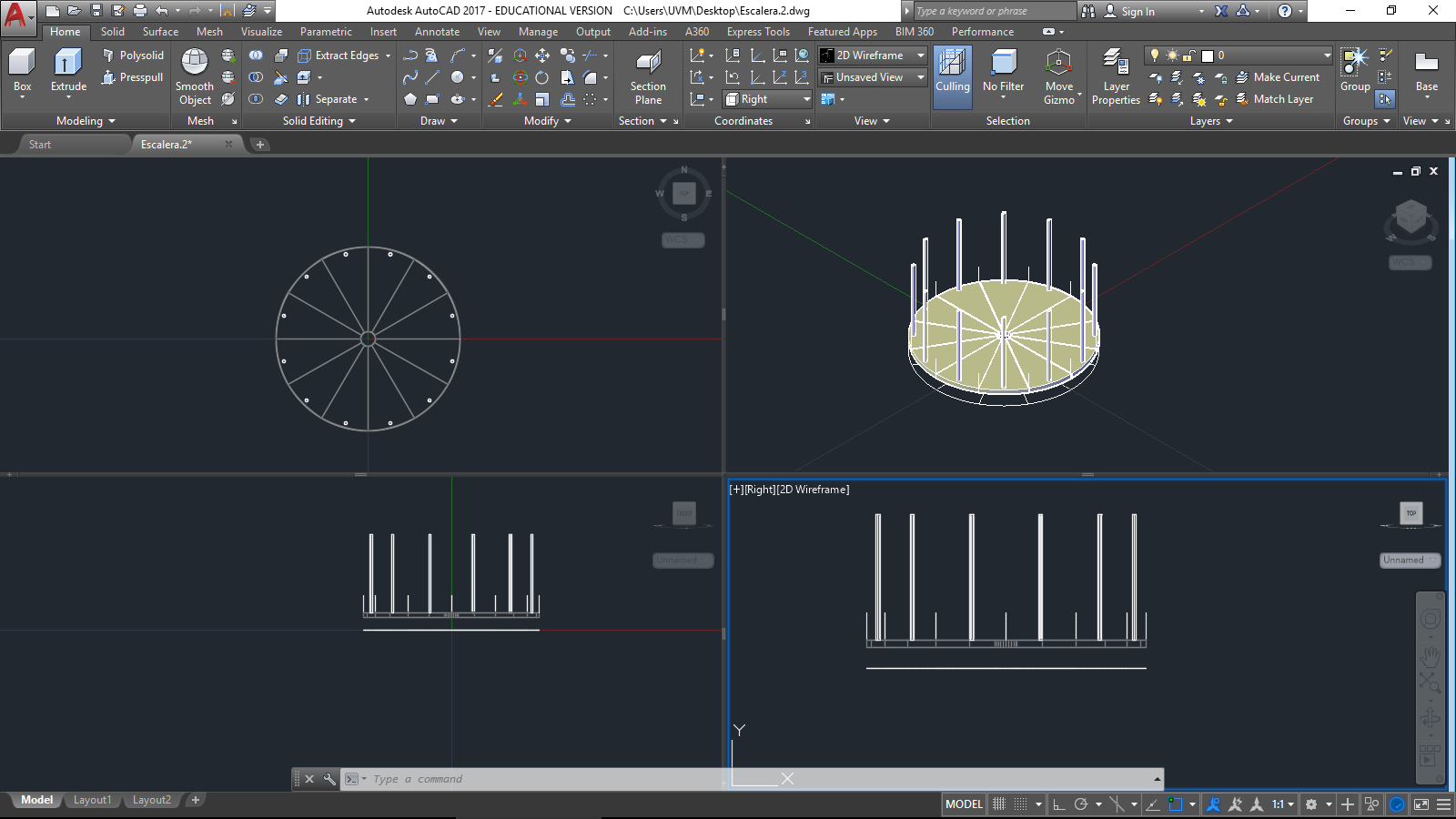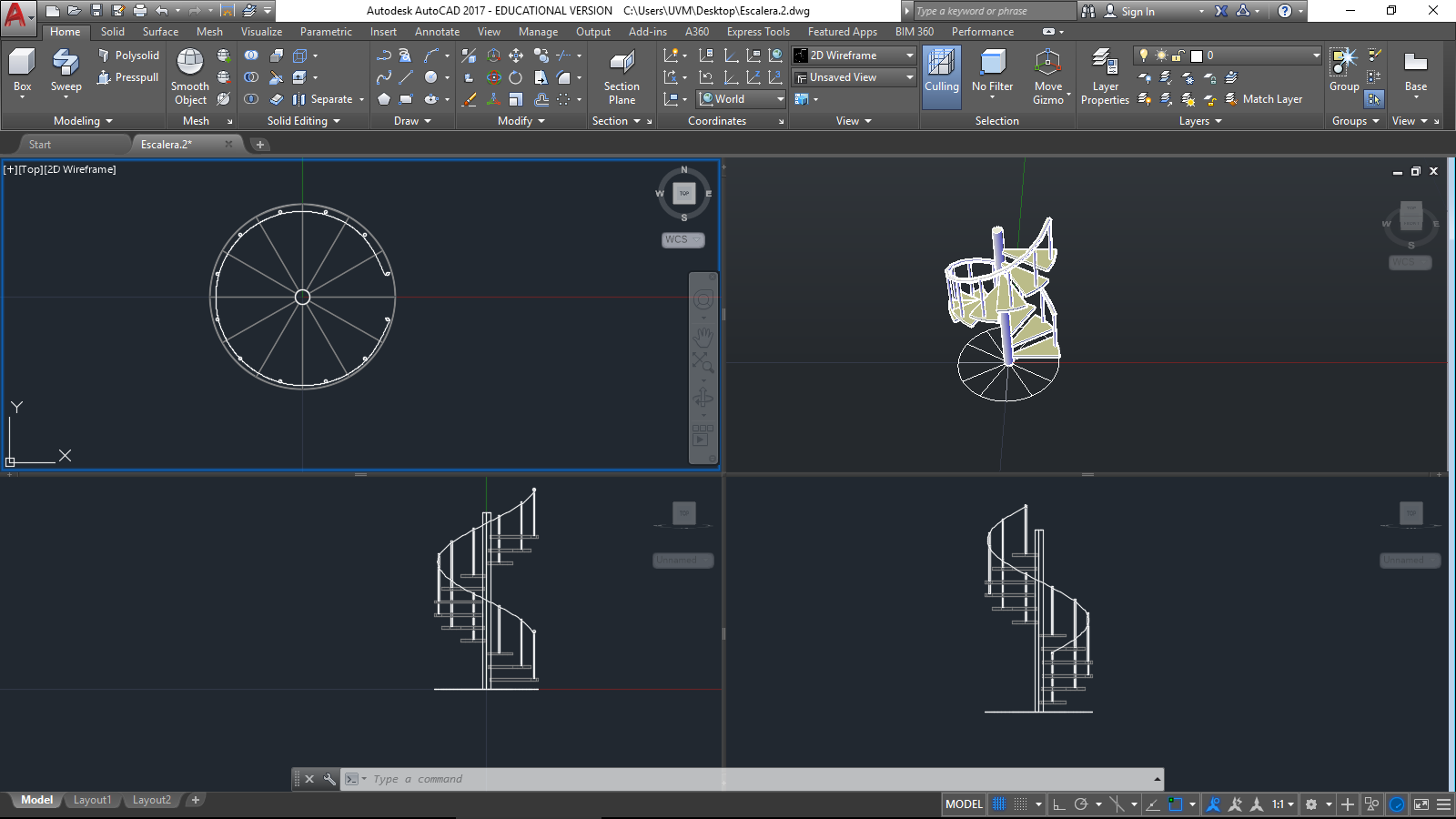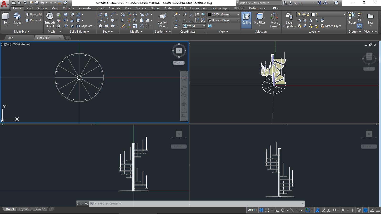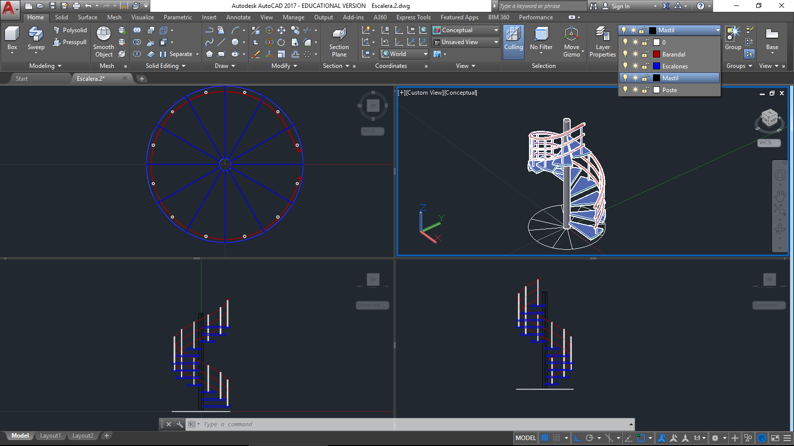 Durante esta actividad se realizó una escalera de caracol con dos metros de diámetro con 12 escalones y postes, con 3 tubos como barandal y un mástil en medio de los escalones. Todo esto se encurta separado por cinco layers (capas): Escaleras, postes, barandal, mástil y 0.